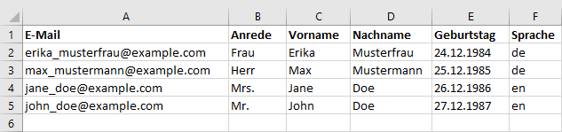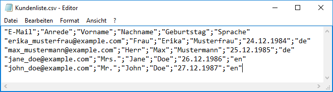 Abonnenten: ImportWahrscheinlich haben Sie bereits eine Liste von Adressen zusammengestellt, die Sie per Newsletter anschreiben möchten. Über das universelle CSV-Dateiformat lassen sich Ihre Adressen aus nahezu jeder Datenbank oder Tabellenkalkulation (z. B. Microsoft Office oder Open Office) exportieren und anschließend in 4SELLERS Mailmanagement System importieren. Um die Zuordnung der Spalten (z. B. Vorname, Nachname, E-Mail) beim Import zu erleichtern, sollte die erste Zeile Ihrer CSV-Datei aussagekräftige Spaltenüberschriftten enthalten. Ein Beispiel: