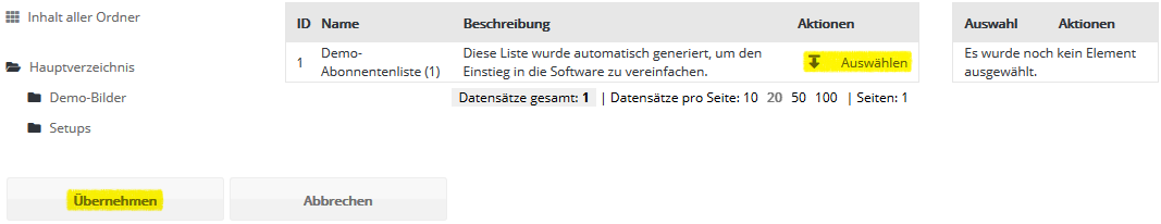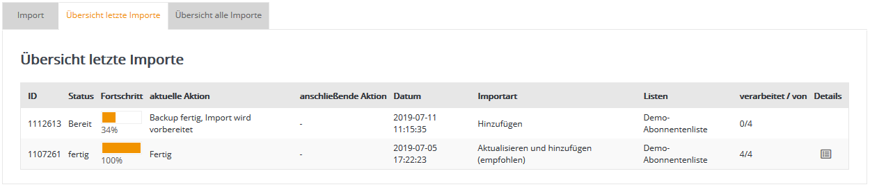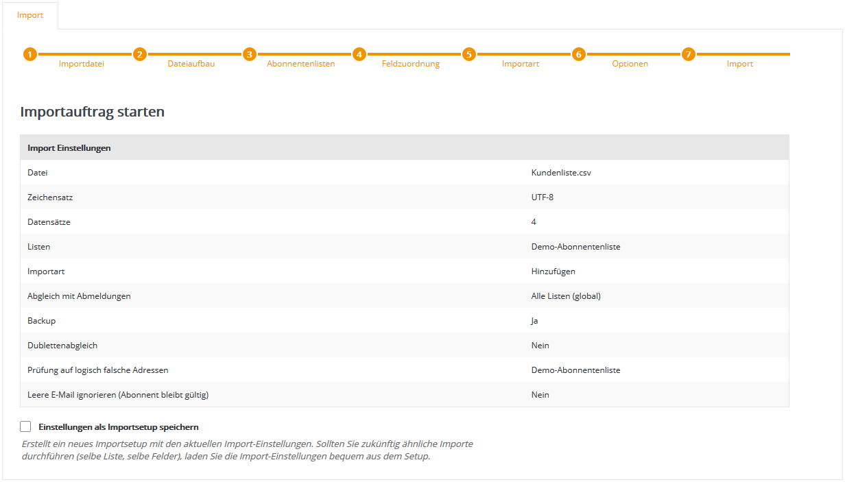 Schritt 3 - AbonnentenlistenWählen Sie nun aus, in welche 4SELLERS Mailmanagement System Abonnentenliste ihre CSV-Datei importiert werden soll. Falls Sie zuvor keine eigene Abonnentenliste in 4SELLERS Mailmanagement System angelegt haben (siehe Menü Abonnentenlisten), steht zum schnellen Einstieg die leere Abonnentenliste 'Demo-Liste' bereit. Diese Liste wird in der Regel bei der Einrichtung Ihres 4SELLERS Mailmanagement System Kontos angelegt und zur Demonstration mit einem Beispiel-Abonnenten befüllt.