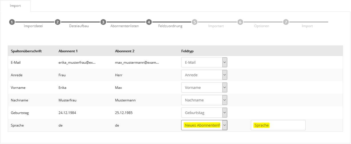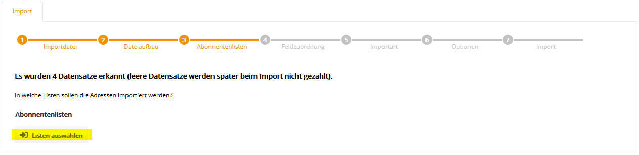 Auch die Auswahl mehrerer Abonnentenlisten ist möglich, falls Sie parallel in mehrere Listen importieren möchten. Klicken Sie nach Auswahl der gewünschten Liste(n) auf 'Übernehmen' und anschließend auf 'Weiter'. Der Name einer Abonnentenliste lässt sich im Menü Abonnentenlisten auch nachträglich jederzeit ändern. Schritt 4 - FeldzuordnungIn Schritt 4 teilen Sie 4SELLERS Mailmanagement System mit, welche Spalte (z.B. Vorname, Nachname) Ihrer CSV-Datei in welches 4SELLERS Mailmanagement System Abonnentenfeld importiert werden soll. Zum schnellen Einstieg sind typische Abonnentenfelder wie 'E-Mail', 'Anrede', 'Vorname' und 'Nachname' in 4SELLERS Mailmanagement System bereits vorhanden.