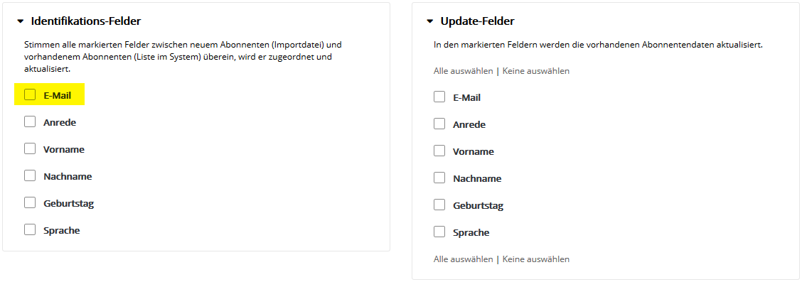 --> Importart: ErsetzenAlle Daten der ausgewählten Liste(n) werden gelöscht und durch den importierten Inhalt der CSV-Datei ersetzt. Bitte beachten Sie, dass mit den aus der Liste gelöschten Abonnenten auch deren bisheriges Nutzerverhalten (Öffnungen, Klicks, Bounces), wie z.B. 'hat letztes Mailing erhalten' und darauf aufbauende Zielgruppen-Definitionen verloren gehen. Sollte das nicht gewünscht sein, ist 'Importart: Aktualisieren und hinzufügen' die passende Alternative.