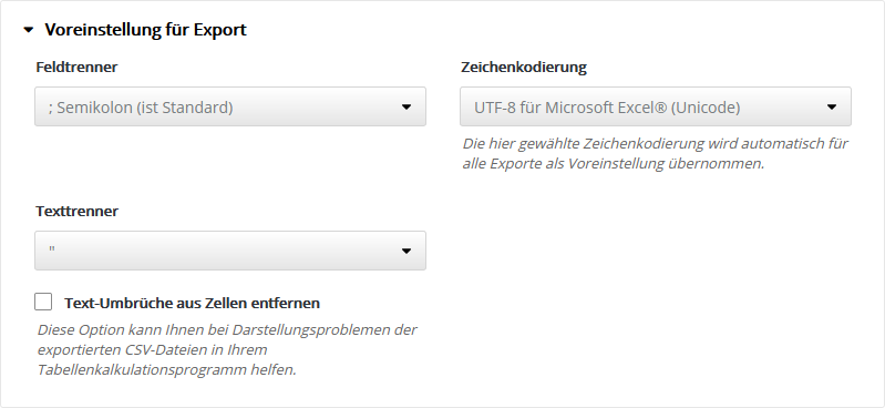 Folgende 'HTML-Editoren' sind in 4SELLERS Mailmanagement System integriert und nutzbar: Grundeinstellung ExportHier legen Sie die Voreinstellung für den Export von CSV-Dateien fest, z. B. für den Export von Abonnentendaten. Bei der Durchführung jedes Exportes können Sie bei Bedarf auch eine abweichende Einstellung wählen. Standardeinstellung ist die Option 'UTF-8 für Microsoft Excel® (Unicode)', technisch gesprochen 'UTF-8 mit BOM'. Dieses Format wird von den meisten Officeanwendungen automatisch erkannt, so dass Umlaute und Sonderzeichen ohne manuelle Formatwahl korrekt importiert werden. StatistikeinstellungenTragen Sie Ihre eigenen Maximalwerte ein, um die rot|gelb|grün Farb-Umschaltung der Statistik-Anzeige für Öffungsrate, Klickrate und Bouncerate an die typischen Werte Ihrer Mailings anzupassen. Nur Ihre besten Mailings sollten den grünen Bereich erreichen. Die Farb-Umschaltung erfolgt automatisch in Drittel-Stufen des eingetragenen Maximalwertes. Empfehlung: Notieren Sie aus der Statistik Ihrer bisherigen Mailings die Durchschnittswerte für Öffnungsrate, Klickrate und Bounces. Damit dieser Durchschnittswert zukünftig im mittleren Drittel der Skala landet, tragen Sie das Doppelte dieses Wertes als Maximum in das jeweilige Feld ein. Tragen Sie z. B. 30% als Maximum ein, dann werden anschließend die Werte bis 10% rot, bis 20% gelb und darüberliegende Werte grün gefärbt. Sie sehen sofort, ob Ihr aktuelles Mailing über- oder unterdurchschnittlich abschneidet. Typische Durchschnittswerte: