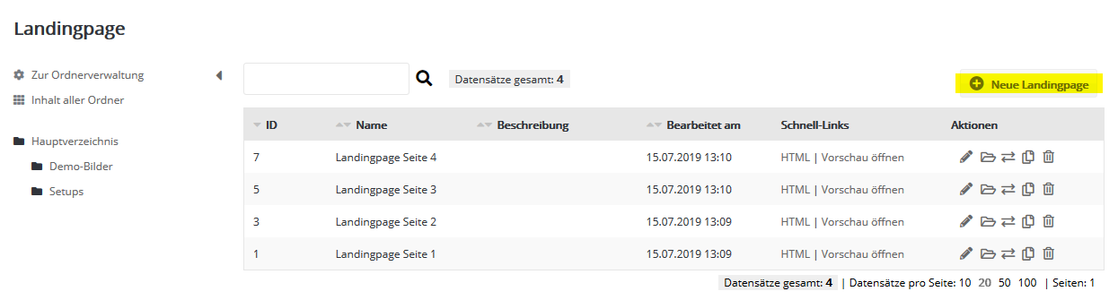 Um eine neue Landingpage anzulegen, klicken Sie oben rechts auf 'Neue Landingpage' und geben anschließend den gewünschten Namen Ihrer Landingpage ein. GrundeinstellungenHier hinterlegen Sie den Namen und die (optionale) Beschreibung Ihrer Landingpage. Außerdem können Sie ein Landingpage-Template wählen, um Ihre Landingpage ohne HTML-Kenntnisse zu befüllen.