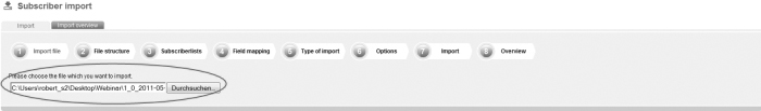 Save the file as a file with the feature 'CSV (Comma delimited)'. Apple user: If you own an apple computer, you will have to safe the file as 'CSV-Windows'. 4SELLERS Mailmanagement System does not run files in the Mac format. Step 1 – Import fileOn the navigation bar click on 'Subscribers' and then go to the navigation subitem 'Import'. This is the way how you get to the menu-guided import function of 4SELLERS Mailmanagement System. First, you will have to choose the file which you want to import; |