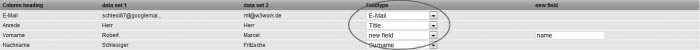 if the first line of your address file contains (as shown in the example above) the column headings, leave the item 'First line contains column headings' marked . Otherwise, if your address file starts right away with the subscriber data, unmark this option. Step 3 – Subscriber ListsChoose the subscriber list to which you want to import the addresses. Subsequently click on 'Next'. Step 4 – Field MappingNow you are asked to match the field names of your subscriber data with those of 4SELLERS Mailmanagement System. In order to do so, please choose in the drop down menus the associations which correspond to field information displayed to the left of these menus. If there does not exist a matching subscriber field, choose 'New Field' and enter a name for the subscriber field that needs to be created. Click 'Next'.
