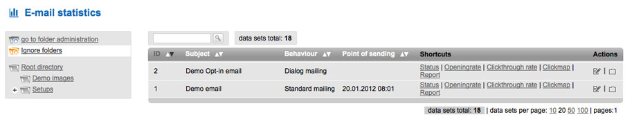 Here you find the statistics of all sent mails. For easier access 4SELLERS Mailmanagement System already includes a demo-mail you can view. |
