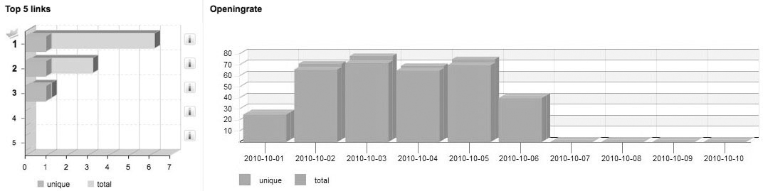 Finally you find two charts: The first shows the 'top 5 links', the second the 'openingrate' of the mailing within ten days after the dispatch.