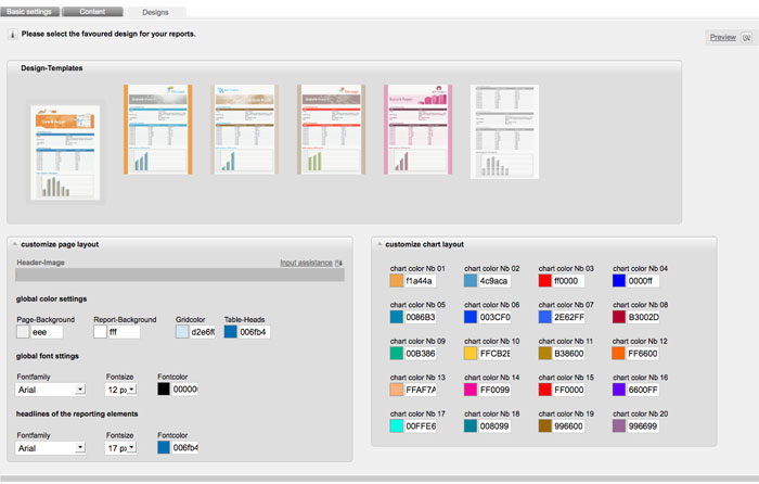 Now you also can adjust the design of your report. Choose the tab 'designs'. By default 4SELLERS Mailmanagement System suggests you six different layouts. HTML experts can also open the 'advanced settings' below the layouts to edit the html-code. For example you can insert your logo in th header.