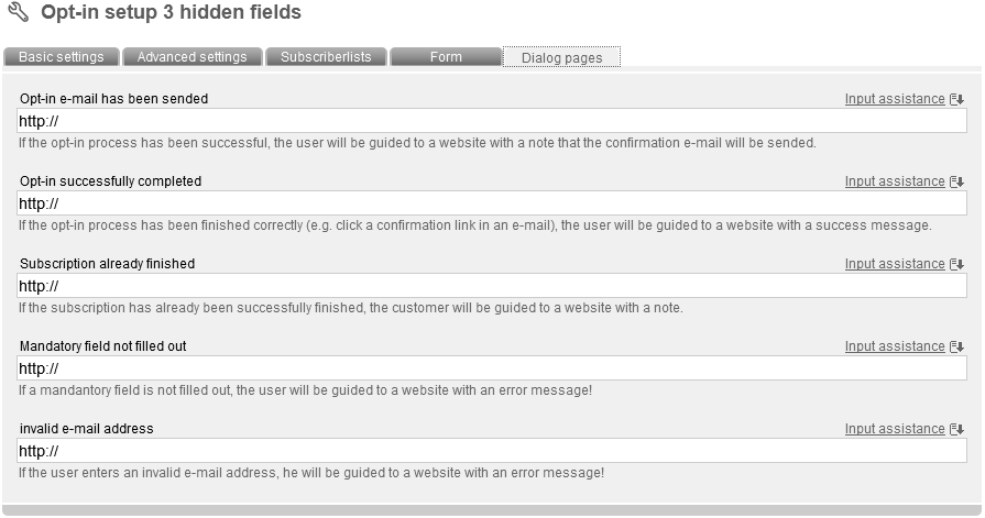 Now enter a name and an optional description for your optin setup. Then choose the 'mode' (important). The following modes are supported by '4SELLERS Mailmanagement System': Double Opt-in with confirmation e-mail (recommended as the only legally secure login variant): Interested party visits a website with an optin setup form. He enters his data into the form. He gots an e-mail with content like this: „Thank you for your optin. Please confirm the registration confirmation link to complete your registration.“ He clicks the link. Registration is completed. He gots a „welcoming“ e-mail. You can integrate information about your company and a certain design as well. Double Opt-in: Like described before, but without sending of a „welcoming“ e-mail. Confirmed Opt-In: Nach Anmeldung auf der Webseite wird sofort eine automatische Begrüßungsnachricht versendet. Single Opt-in: No e-mails will be send. There just will be a message in your browser, that registration was successfull. According to the mode you've choosed, you have to adapt different sub-options. In Tab 'advanced settings' you can deposit your e-mail address in field 'e-mail forwarding', to be informed about new subscribers. In field 'mailing for later delivery' you can determine your last sended newsletter. All new subscribers will receive your last mailing and don't have to wait for another one. To protect your optin-form against abuse, activate the invisible captcha . Captchas are often used to check if petitions are produced by a machine (robot, short: bot) or a real person. Bots are often used abusive to generate masses of subscriptions. Choose your favorite subscriberfields, which should be filled in in next tab 'Form'. After clicking 'Add subscriberfield' a pop up appears, where you can select and add subscriberfields to your optin-form. Furthermore you can add one or more subscriberlists as option(s) in a ceckbox through the button 'add subscriberlist'. Click 'sort formfields' to edit order of your fields. Click 'test form' to check your form by a preview of your optin-form. Next tab: 'Dialog pages':