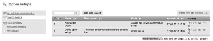 Through 'Setups' and 'Optin Setup' you can create forms, which can be included into your website. So interested parties can login automatically on your website for your subscriberlist(s). Please note: Requirement for a successfull 'optin setup' is to create an e-mail with type 'dialog mailing' for registration confirmation and welcoming, which got the status 'activated'. Otherwise those mailings will be lacking in the shortlist of mailings which you can choose for your optin setup. For an esier start 4SELLERS Mailmanagement System gots a „Demo optin setup“ for you. Created optin setups can be 'opend' afterwards for editing, 'moving' to another folder or 'deleting'. If you have moved an optin setup into another folder, click 'open folder' to get into. Create new Optin setup |