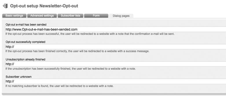 Enter a name and an optional description. Choose the 'mode' (important). The following modes are supported by '4SELLERS Mailmanagement System': Double-optout with confirmation e-mail: after unsubscribe from your website or your newsletter a confirmation email will be send automatically. Optout will be activated after clicking the confirmation link in this email. After successful unsubscription the former subscriber will get a last email („You unsubscribed successfully of our newsletter.“) Double Optout: Like described before, but without sending of a „successful unsubscription“ e-mail Confirmed Opt-Out (recommended): After unsubsubscription on your website or in your newsletter a „successful unsubscription“ email will be sended immediately. Single Optout: No e-mails will be send. There just will be a message in your browser, that optout was successfull. In Tab 'advanced settings' you can deposit your e-mail address in field 'e-mail forwarding', to be informed about unsubscriptions. Tab 'subscriberlists': Choose your favorite subscriberlist(s), where all unsubscriptions should be logged out. Select the subscriberfields, which should be filled out by your subscribers in tab 'Form'. After clicking 'create form fields' a popup appears, where you can choose and add subscriber fields to your form. Click 'sort formular fields' to arrange your fields. Click 'test form' to open a new tab in your browser with a preview of your form. Source Code of your website is genereated by '4SELLERS Mailmanagement System' by clicking 'Formular soruce code'. A popup appears with your source code. Last tab: Dialog pages |