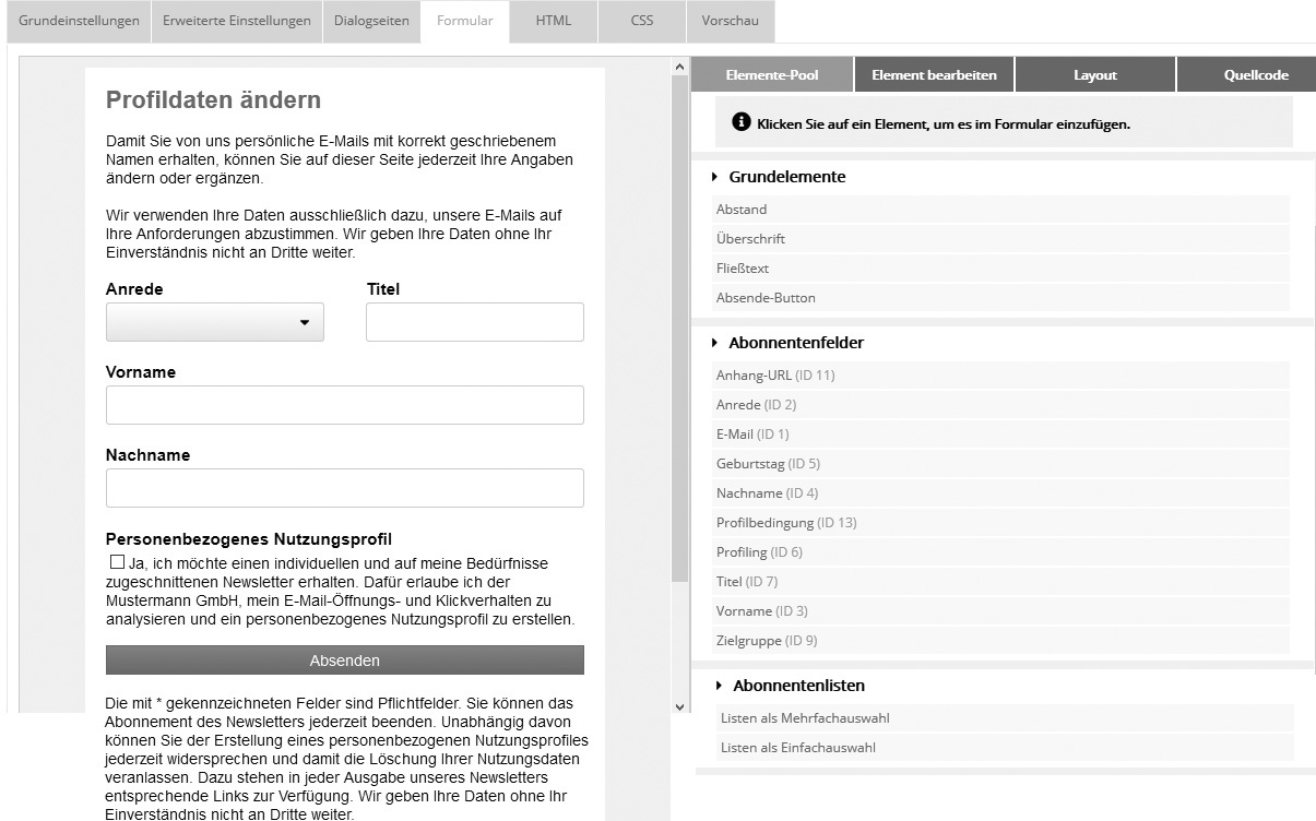 Im Profilmanager erstellen Sie Formulare für Ihre Website, mit denen Abonnenten selbstständig ihre Abonnentendaten ändern können, etwa bei Wechsel der E-Mail-Adresse.