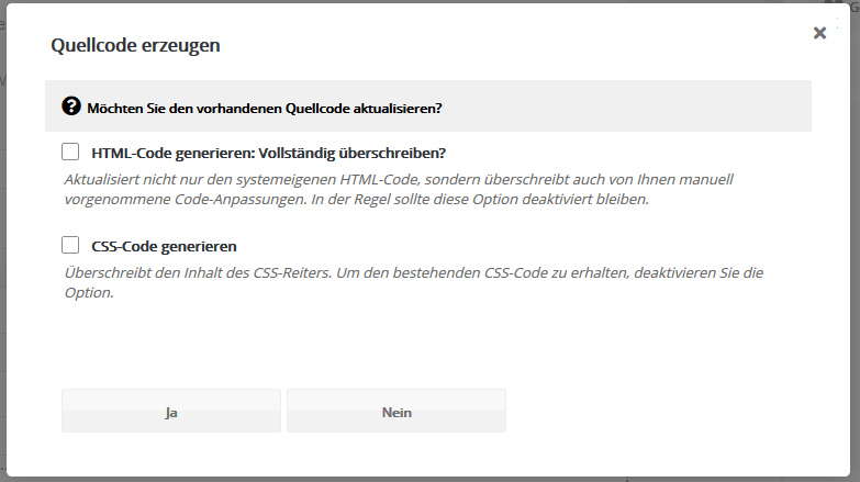 Auch im neuen Codeformat (seit Februar 2017) lässt sich der vom System erzeugte Quellcode bei Bedarf durch eigene Anpassungen ergänzen, das betrifft HTML, JavaScript und CSS.