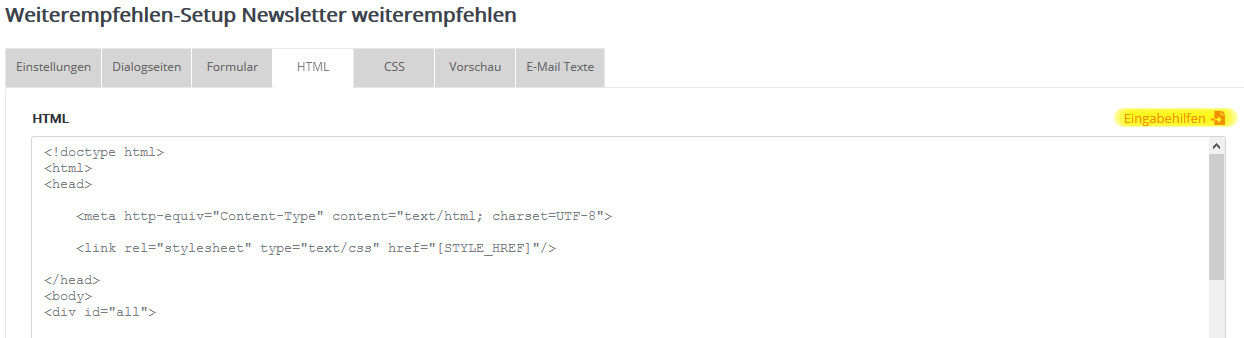 Um die Weiterempfehlen-Funktion im Template bzw. Mailing einzubinden, verwenden Sie bitte die 'Eingabehilfen'. Im Bereich 'Links' wählen Sie das Weiteremfehlen-Setup aus und verlinken dieses. Des Weiteren müssen Sie über die 'Eingabehilfen' unter 'Dialoge' den Weiterempfehlen-Bereich auswählen. Es wird Ihnen der Platzhalter '[TAF-AREA /]' eingefügt. Bitte fügen Sie den Platzhalter im HTML nach <body> ein und denken Sie auch daran, in der Textvariante '[TAF-AREA /]' ganz am Anfang vor den eigentlichen Text einzubinden.