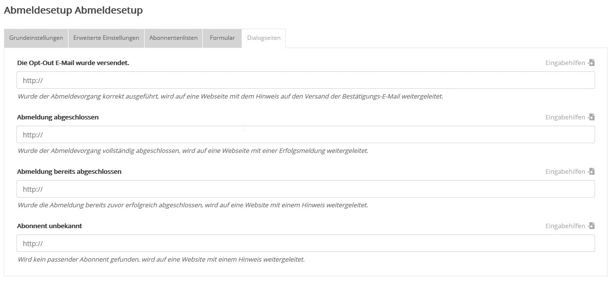 AbonnentenlistenJe nachdem, ob die Abmeldung per Newsletter-Link oder per Website-Formular stattfindet, wird der Abonnent aus folgenden Listen abgemeldet: Variante 1: Abmeldelink im NewsletterFür Standardmails gilt: Zusätzlich zu den auf dem Reiter 'Abonnentenlisten' gewählten Listen findet die Abmeldung auch in den angeschriebenen Listen statt. Für Kampagnen- und Dialogmails gilt dieser Zusatz nicht, da diese nicht an eine bestimmte Liste verschickt werden. Variante 2: Abmeldeformular auf WebsiteDie Abmeldung findet in den unter 'Abonnentenlisten' markierten Listen statt, und wenn vorhanden, dann auch in den direkt im Formular zur Auswahl durch den Nutzer angebotenen Listen (siehe nächster Abschnitt 'Formular'). Beides gleichzeitig ist nicht möglich. Das heißt: Sobald Sie eine Liste im Reiter 'Abonnentenlisten' markiert haben (und damit fest vorgeben), kann sie nicht gleichzeitig im Abmelde-Formular (ab)wählbar sein. Im dem Fall wird sie automatisch aus dem Formular entfernt und umgekehrt. Sonderfall beim Abmeldeformular: Ist keine Liste zur Abmeldung markiert und auch im Formular keine enthalten, dann findet die Abmeldung in allen Listen statt. Damit wird der Abonnent auch aus der 'Abonnentenverwaltung' entfernt. FormularHier erstellt 4SELLERS Mailmanagement System automatisch den Quellcode für ein Abmeldeformular, das Sie auf Ihrer Website einbinden können. Den Inhalt des Formulars stellen Sie per Drag&Drop zusammen. Die Bedienung ist identisch zum Anmeldeformular-Editor. Nach Klick auf den Button 'Test des Formulars' wird Ihr neues Abmeldeformular angezeigt und die Funktion lässt sich anhand realer Abmeldungen testen. Geben Sie gültige und ungültige Abonnentendaten ein, um die entsprechenden Textmeldungen bzw. Dialogseiten zu prüfen. Ein während des Tests abgemeldeter Abonnent lässt sich unter 'Abonnenten' -> 'Abmeldungen' wiederherstellen. --> Hinweis zu Abmeldungen beim Testversand: Solange es sich um den Testversand eines Mailings handelt, findet bei Klick auf den Abmeldelink keine Abmeldung statt. Stattdessen wird lediglich eine Bestätigung angezeigt, ob das Abmeldesetup korrekt eingerichtet wurde. Erst beim späteren realen Versand findet eine tatsächliche Abmeldung statt und es erscheint die von Ihnen eingestellte Dialogseite, die Sie unter 'Formular testen' jederzeit testen können. Dialogseiten |